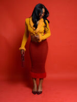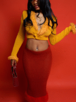 Rojanée is a textured knit set featuring a cropped top and a sleek midi skirt, finished with plush detailing for a bold, elevated look.