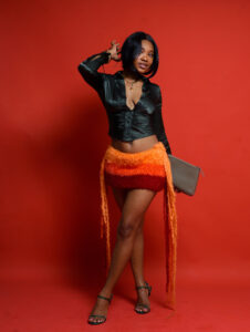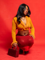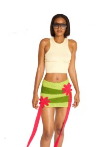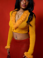 Rojanée is a textured knit set featuring a cropped top and a sleek midi skirt, finished with plush detailing for a bold, elevated look.